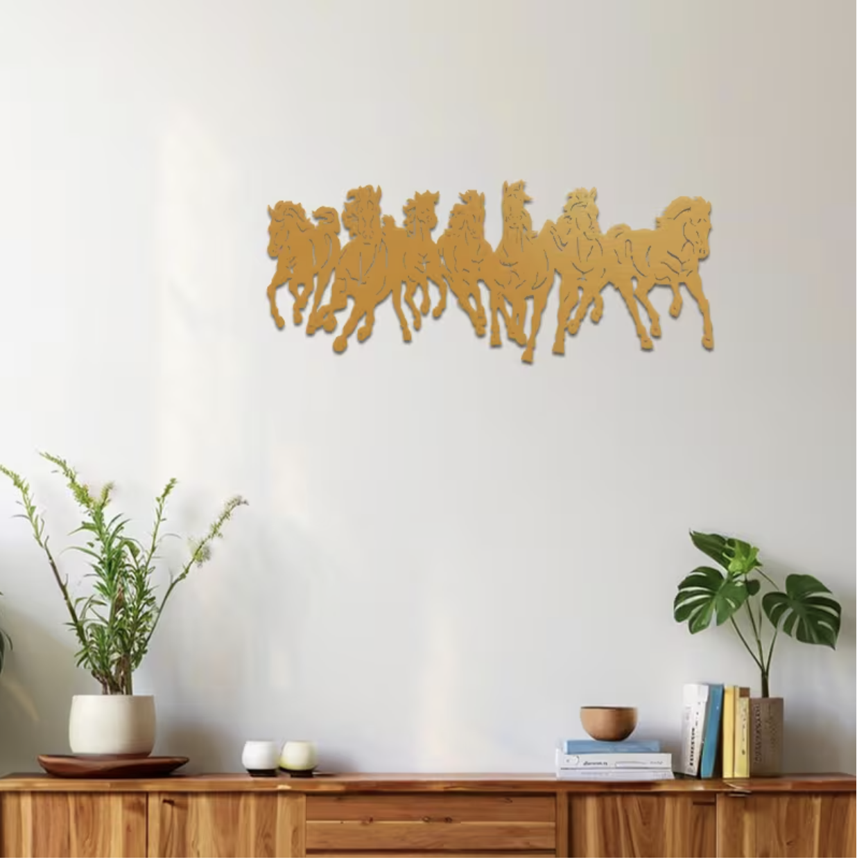 A stylish golden wall décor featuring a running horse design, symbolizing strength, freedom, and success. Perfect for adding a modern and energetic touch to living rooms or office spaces.